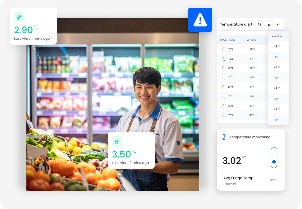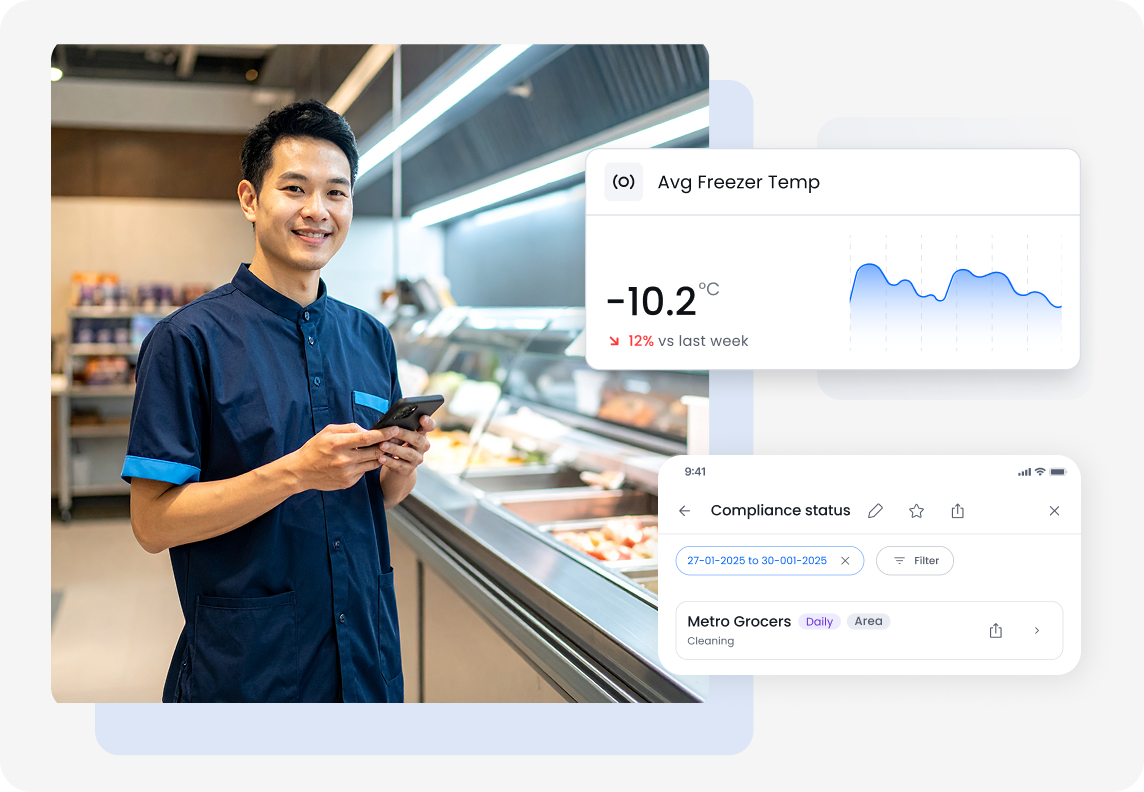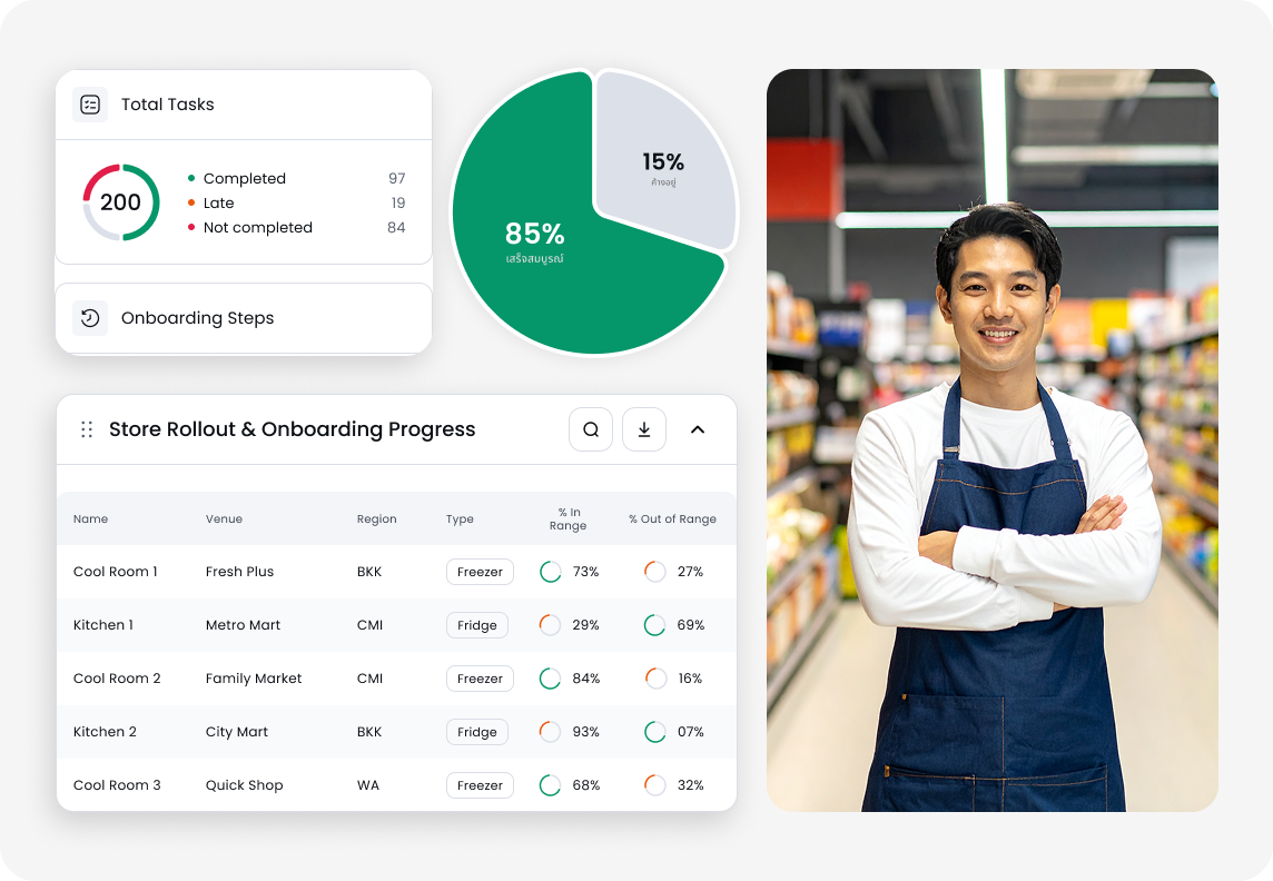 Squizify ช่วยซูเปอร์มาร์เก็ตให้ปฏิบัติตามข้อกำหนด ป้องกันการสูญเสียสต็อก และทำให้การตรวจสอบเป็นเรื่องง่าย ครอบคลุมทั้งแผนกอาหารสำเร็จรูป เบเกอรี่ ผักผลไม้ อาหารทะเล และพื้นที่เก็บเย็น